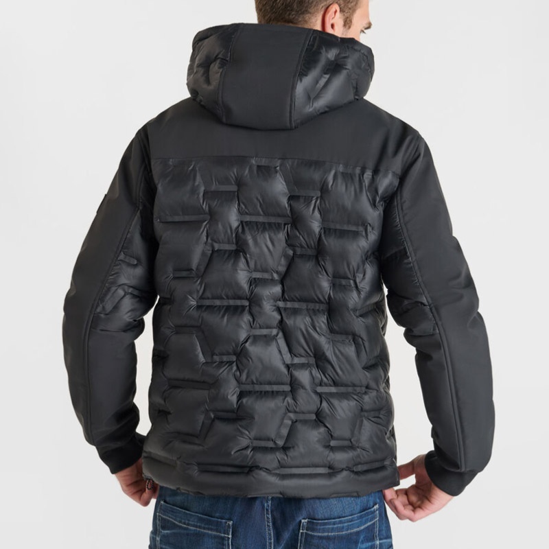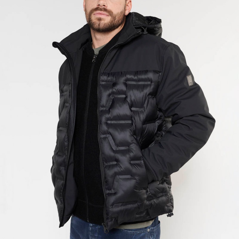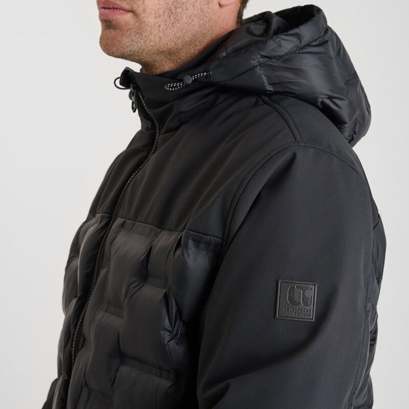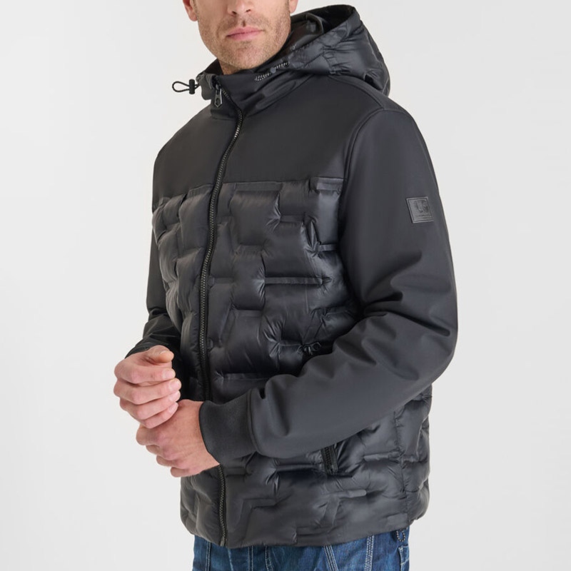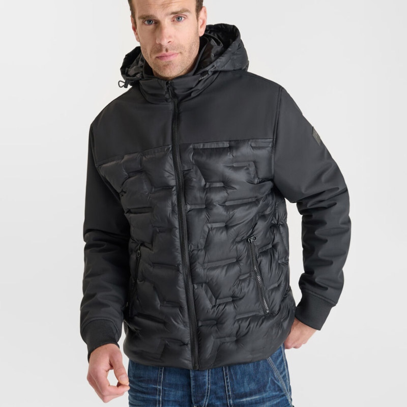 Veste / Blouson hybride Le Temps des Cerises pour homme, modèle Rejan noir, corps type doudoune, manches et haut type softshell.