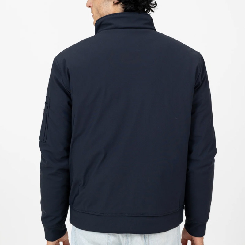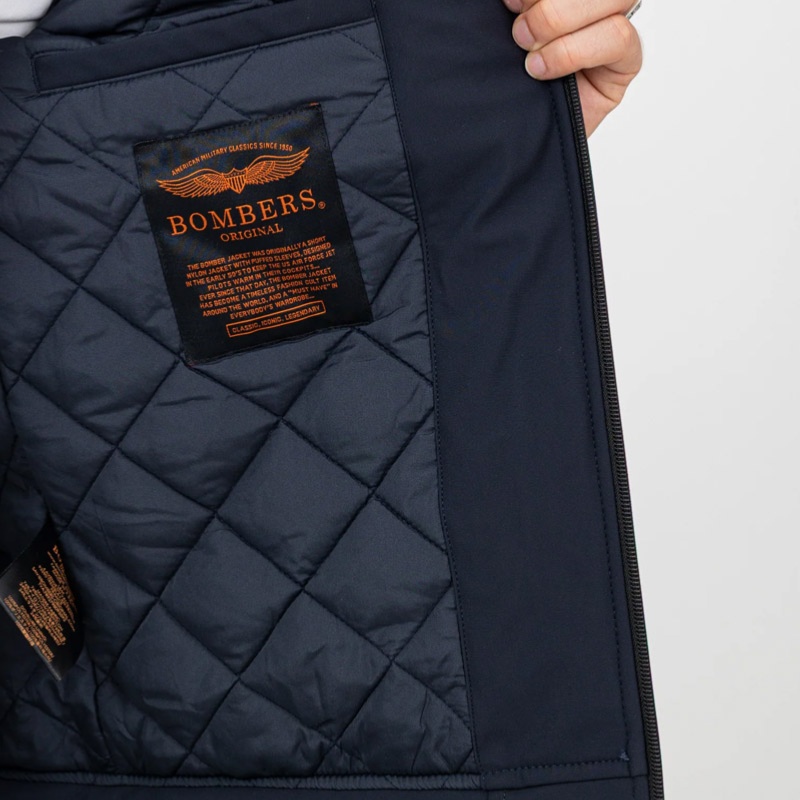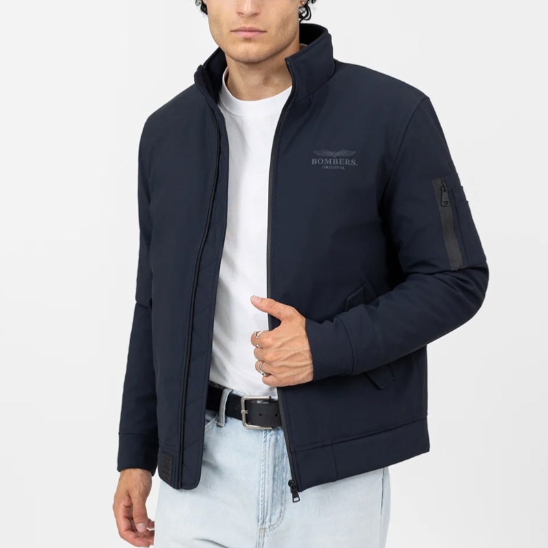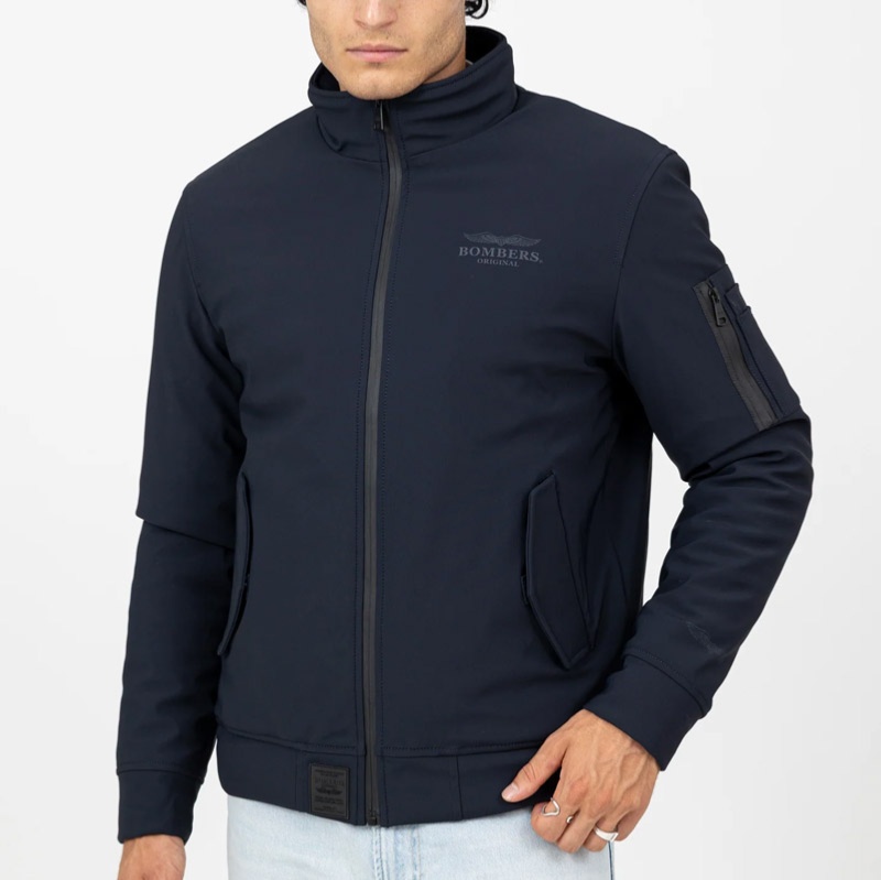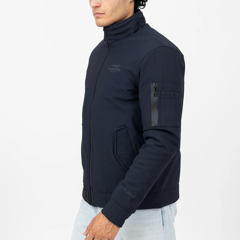 Blouson en softshell Bombers Original modèle Willburn bleu marine navy, avec doublure et rembourrage, cette veste sera idéale en mi saison et hivers grâce a son softshell déperlant et son excellent confort thermique.