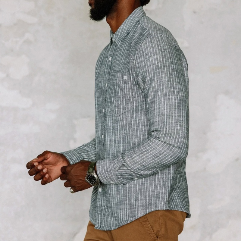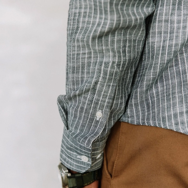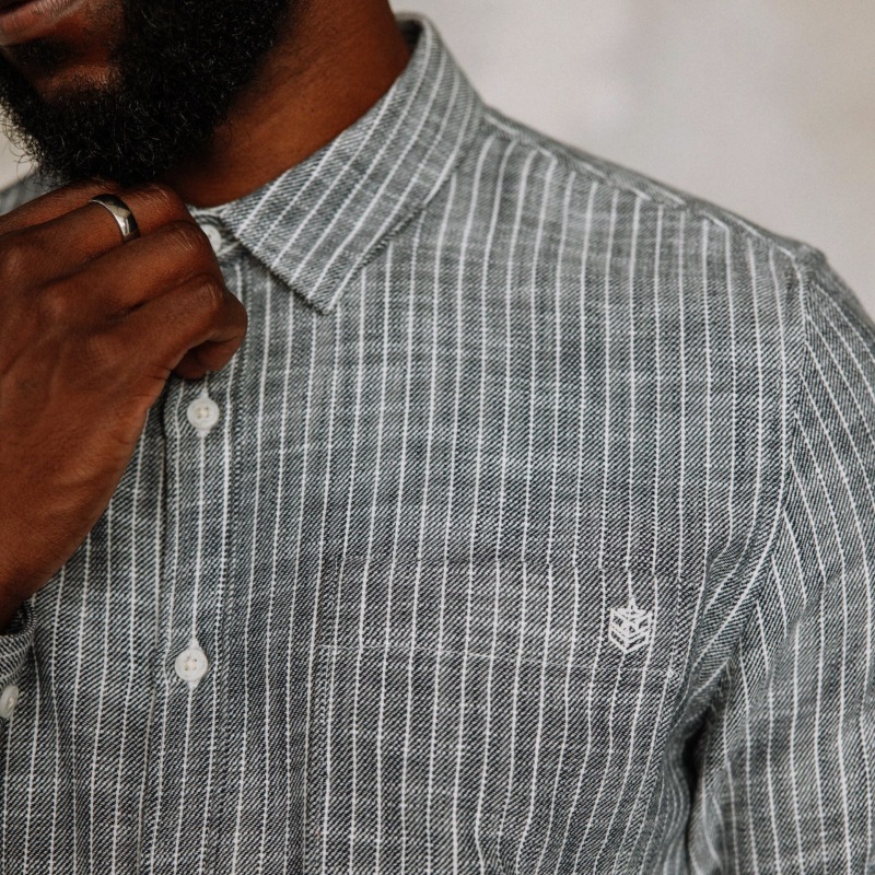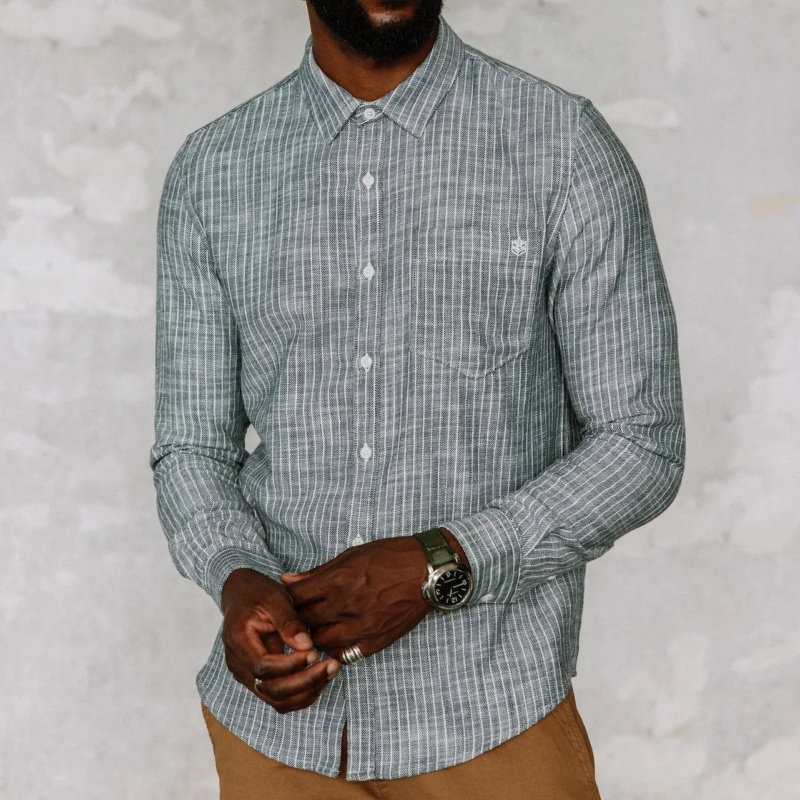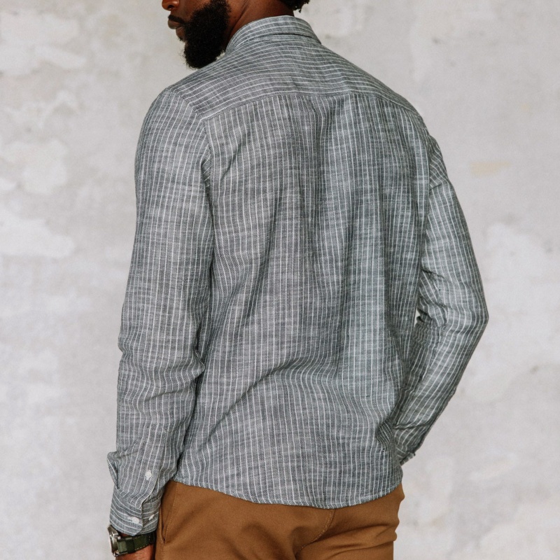 Chemise homme à manches longues Freeman T Porter modèle Jeremiah Sluban en coton flammé "slub" gris à fines rayures blanches.