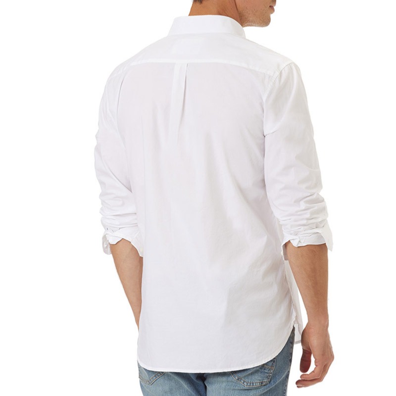 Chemise manches longues Us Polo Assn pour homme, coupe slim fit, confectionnée en coton stretch blanc, logo joueur de polo double pony brodé bleu marine.