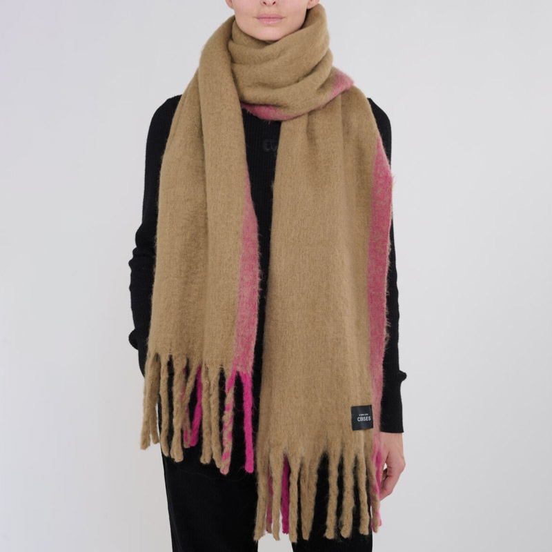 Echarpe longue Le Temps des Cerises Fibs en maille épaisse et douce beige avec liserés roses
