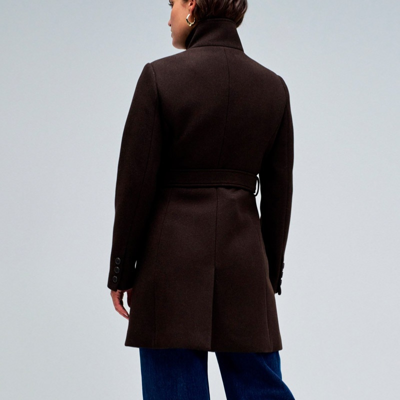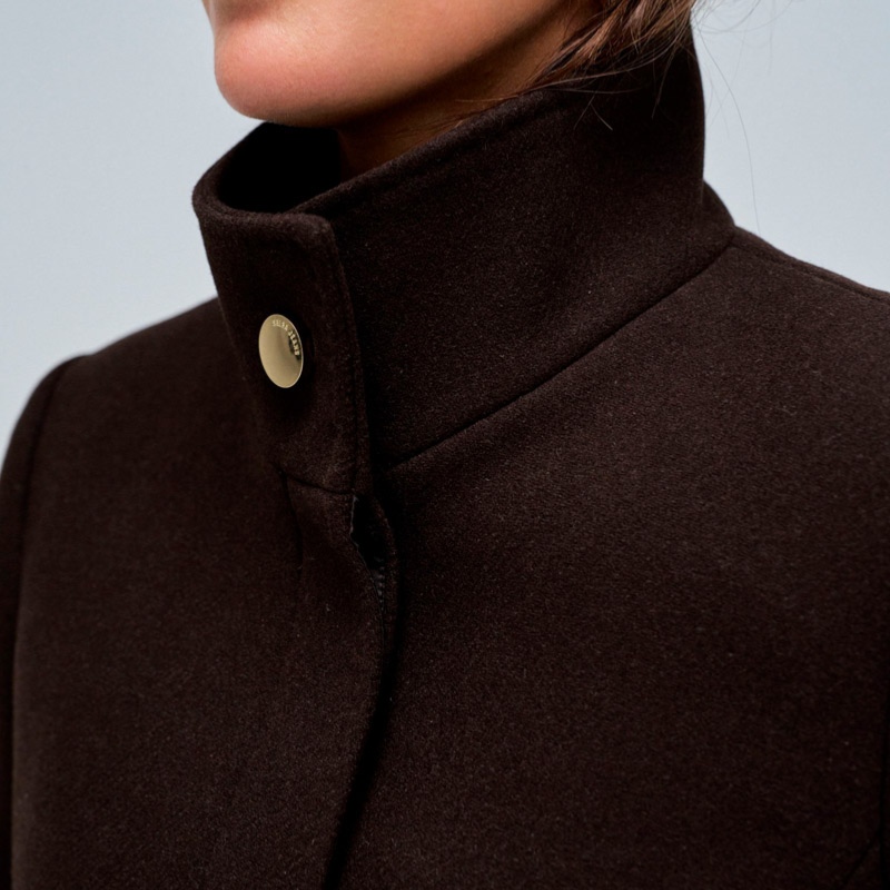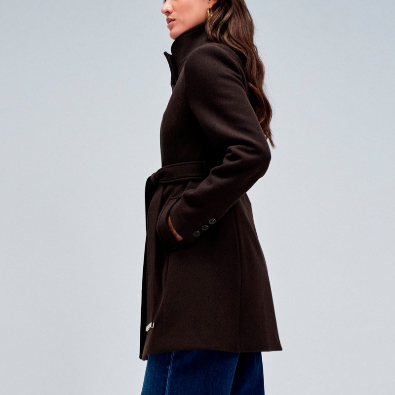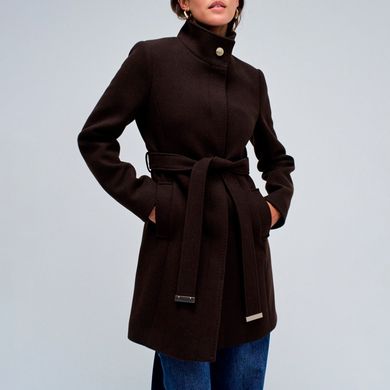 Manteau en drap de laine marron foncé dark brown Salsa pour femme avec boutonnage invisible, col montant et ceinture ton sur ton