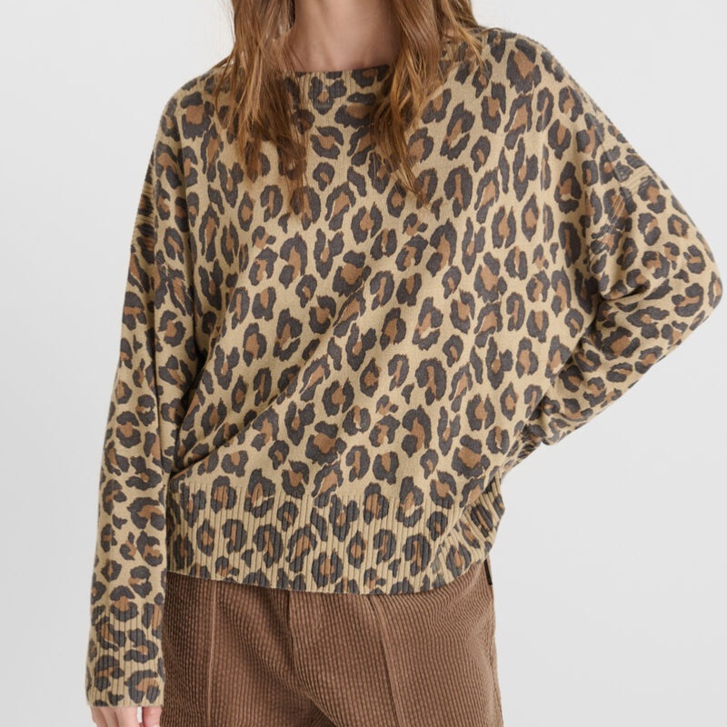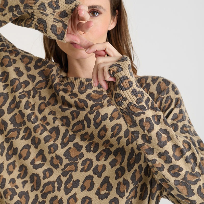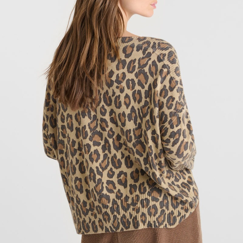 Pull femme Le Temps des Cerises Ludo en maille à motif léopard beige. Il offre un grand confort grâce à une maille haute qualité contenant une petite proportion de laine et de cachemire