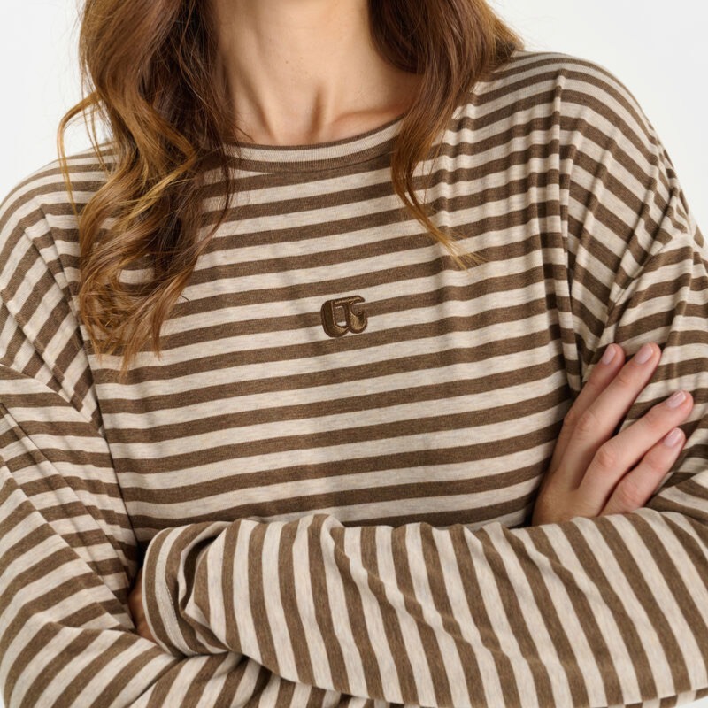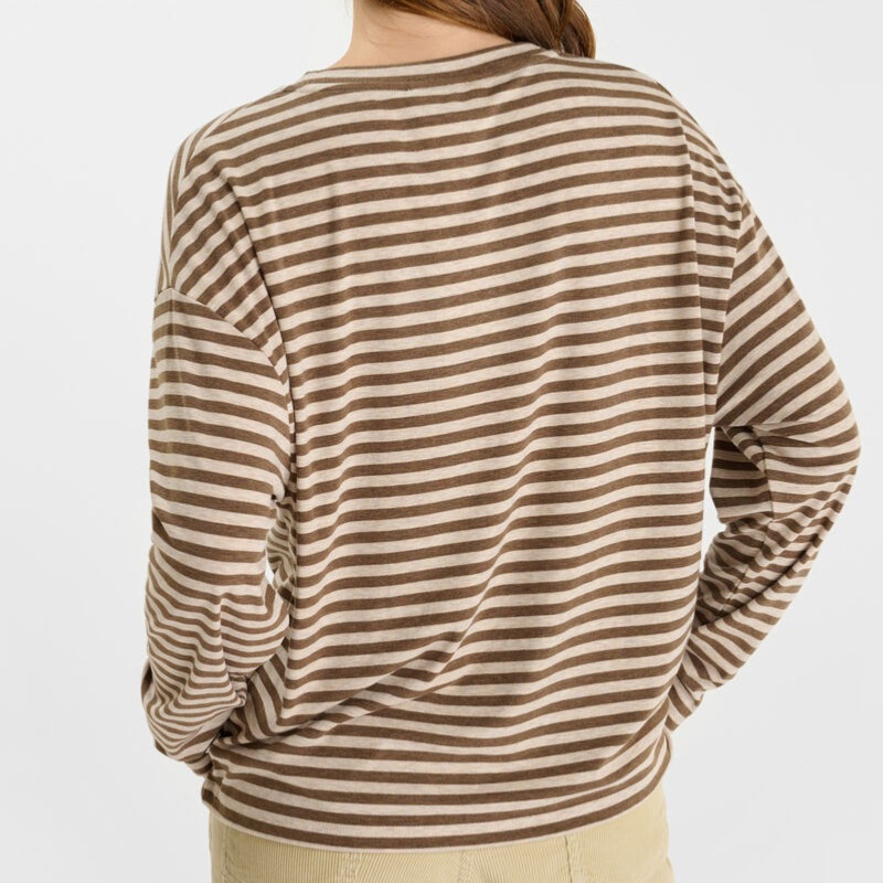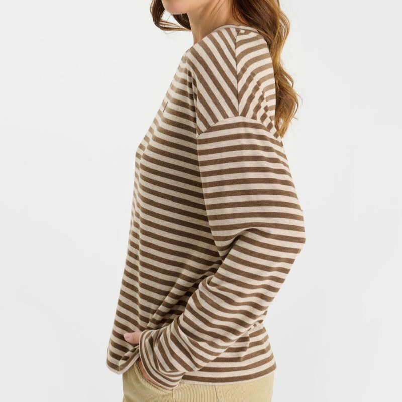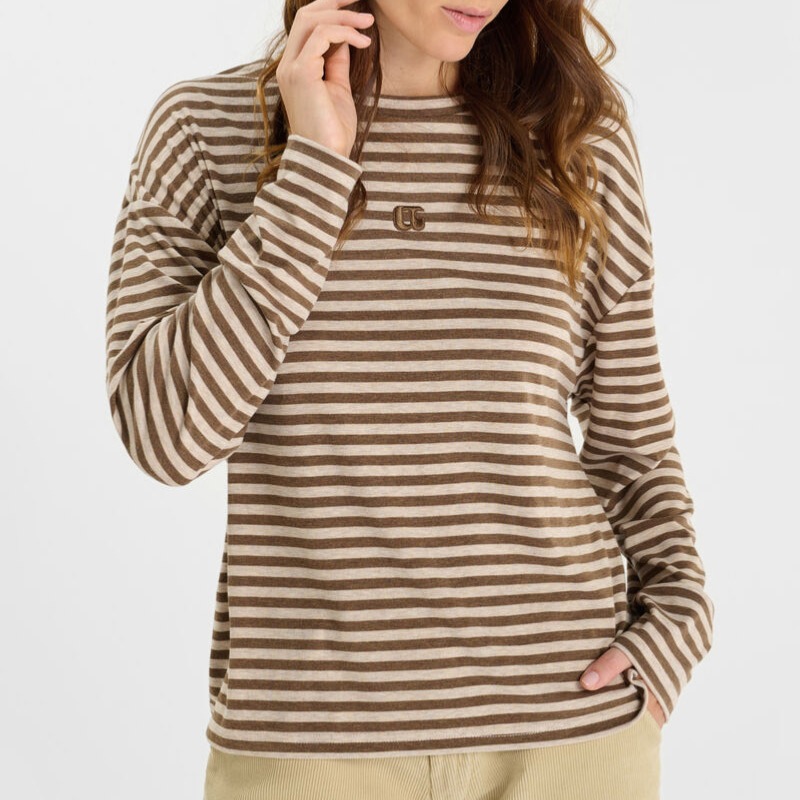 T Shirt / Top manches longues femme Le Temps des Cerises modèle Kina à rayures beige et choco
