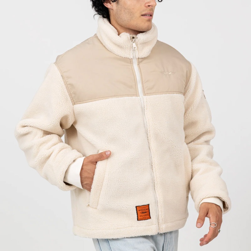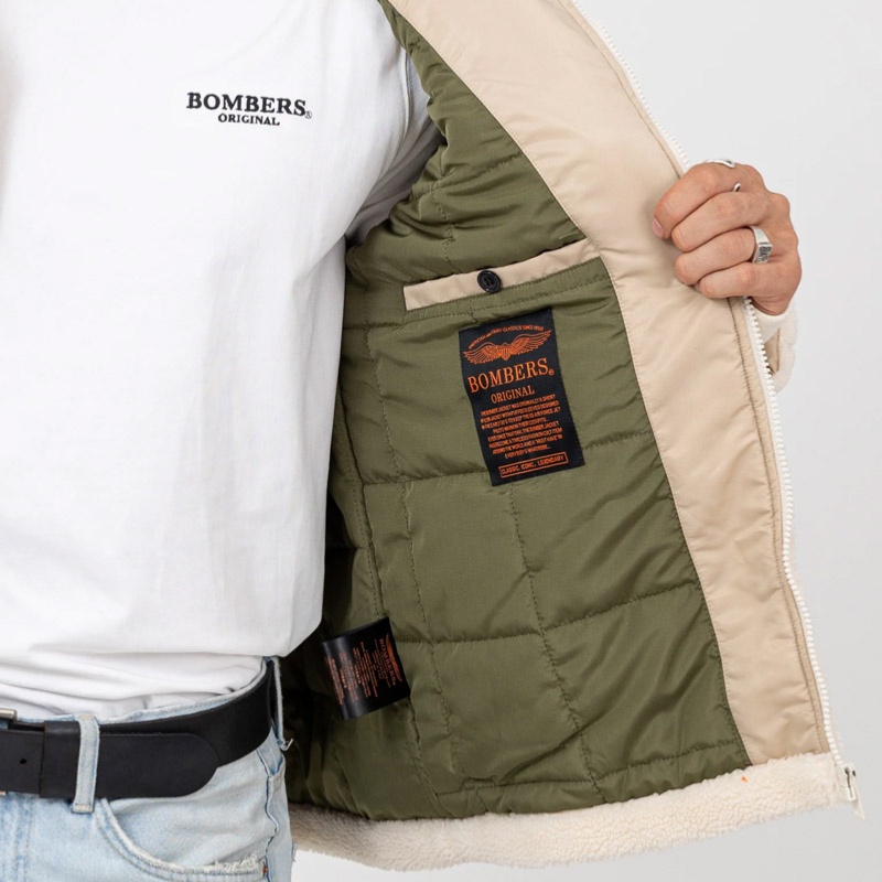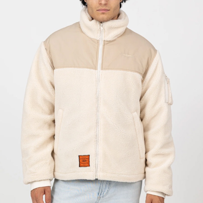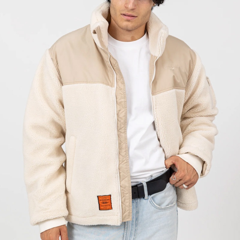 Veste / Blouson en sherpa polaire beige écru avec empiècement nylon aux épaules de chez Bombers Original modèle Monston, entiérement doublé.