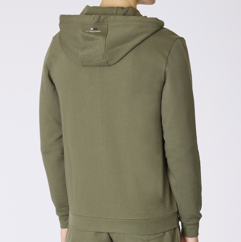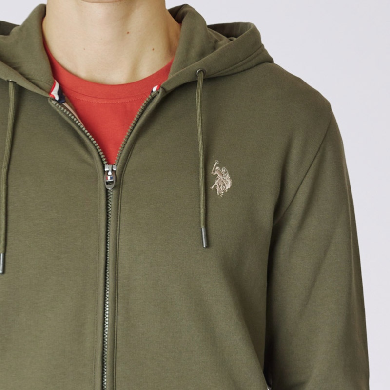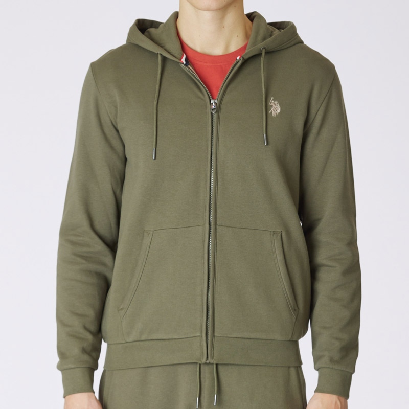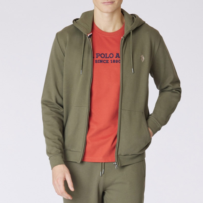 Veste / Sweat zippé capuche Us Polo Assn pour homme, confectionné en molleton de coton doux mélangé vert kaki, logo joueur de polo uspa beige.